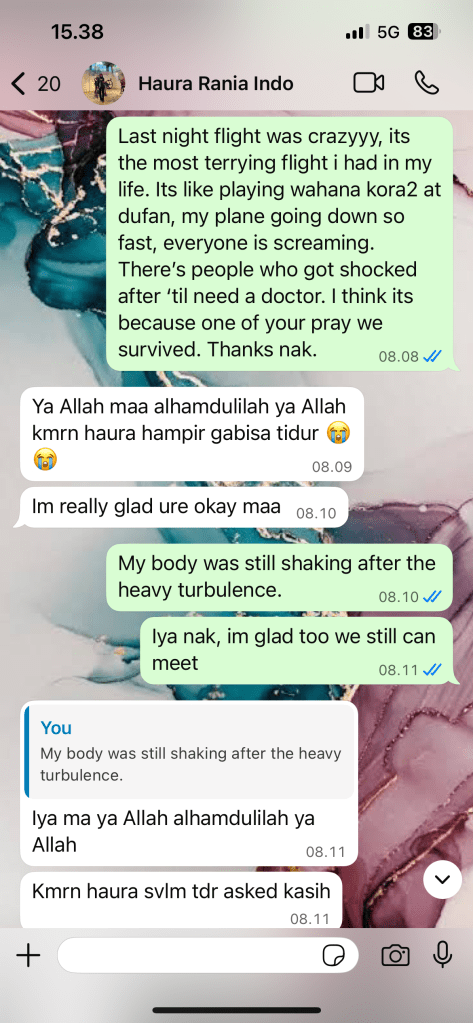 The plane was on the runway, ready to take off. Since I felt so sleepy, I closed my eyes to sleep, but I felt the plane shaking. After a moment, the shaking stopped, so I tried to sleep again. However, I noticed the lights were off and the seatbelt sign was still on. Ten minutes later, we experienced heavy turbulence. I opened my eyes to see that the plane was heavily shaking, and all the passengers seemed aware of the situation. It’s continuing to shake, and suddenly, the plane dropped, feeling like a rollercoaster ride. It’s terrifying! All the passengers were screaming, I was screaming too, and my husband held my hand to comfort me; my hands were still shaking afterwards. A flight attendant announced that a doctor was needed because one of the passengers needed medical treatment probably fainted and had gotten shocked after the incident. Thankfully, after that, the pilot managed the situation and we landed safely at Soekarno-Hatta Airport, Jakarta, Indonesia. Home Sweet Home.